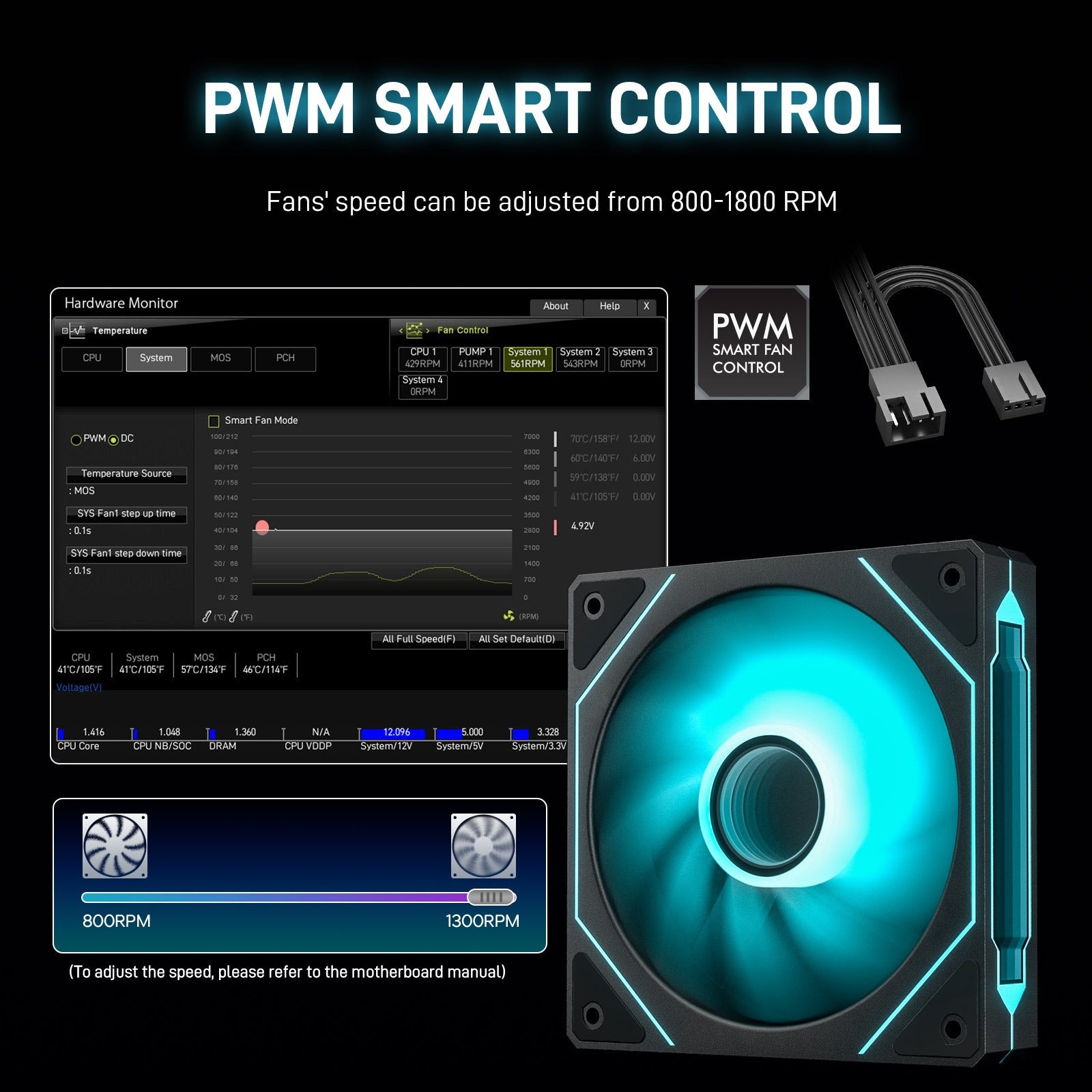 Optimized Cooling Performance: Nine fan blades plus PWM control allow fans to adjust fan speed from 800 - 1300 RPM ± 10% to provide optimal cooling performance