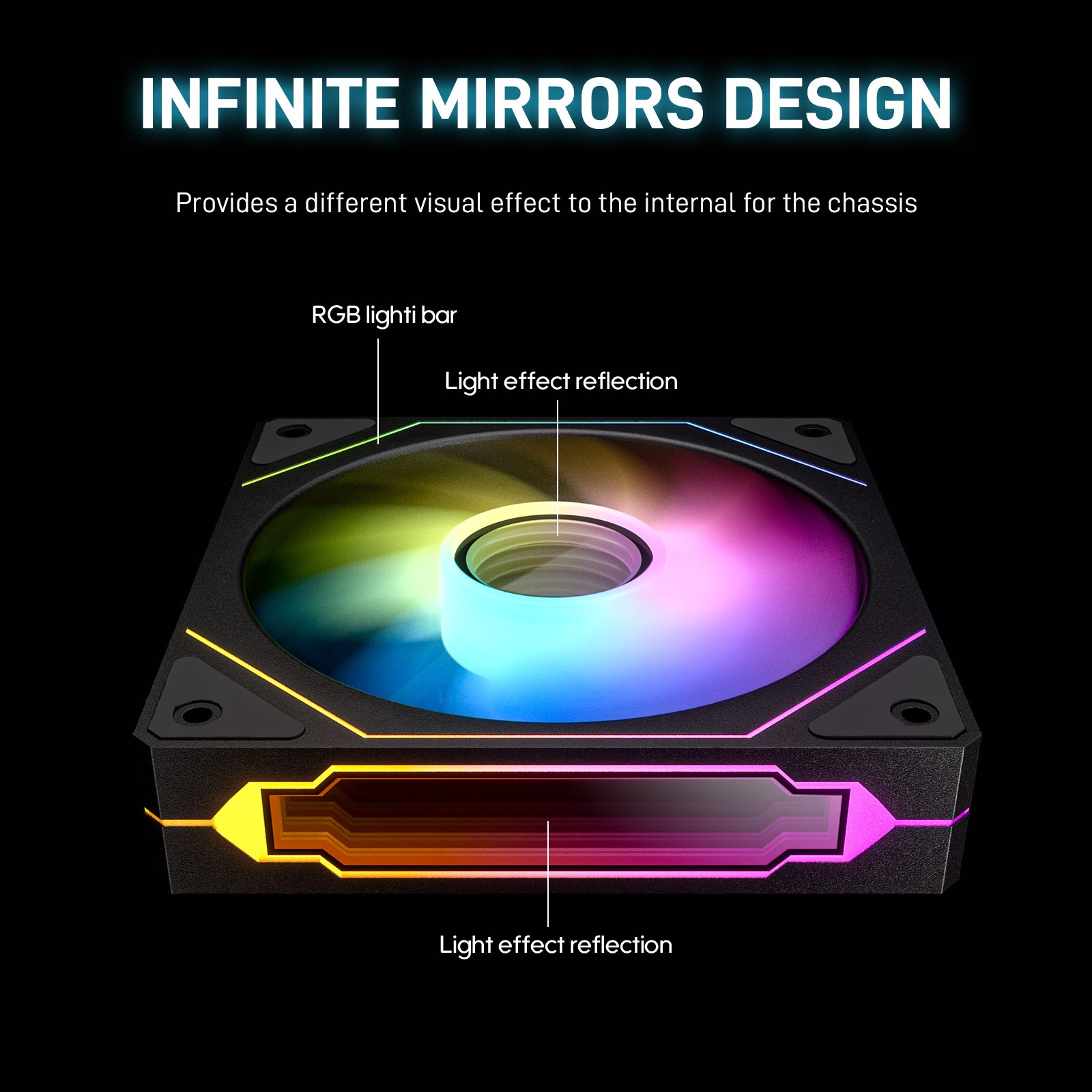 Infinity Design: Infinity Mirror Design case fans provide Infinity visualization of the center and sides of the fan, allowing you to experience stunning multi-layered effects