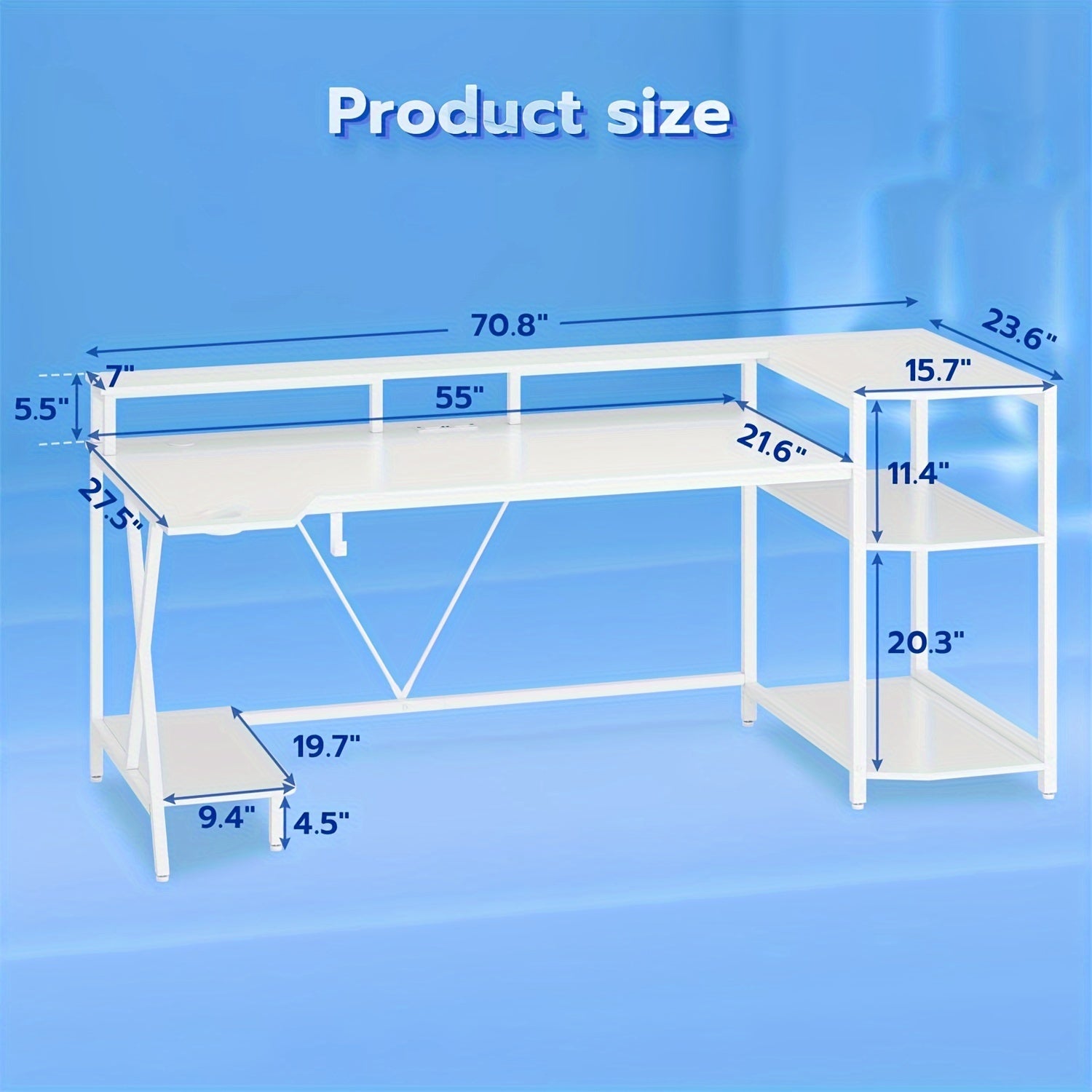 This gaming desk includes three spacious storage shelves, which can be utilized for keeping your large CPU or PC tower, books, speakers, game controllers, and other gaming equipment. The desktop measures 55 inches in length and 21.6 inches in width, providing ample space for your keyboard, mouse, and additional accessories. The expansive workstation is capable of supporting two computers simultaneously.