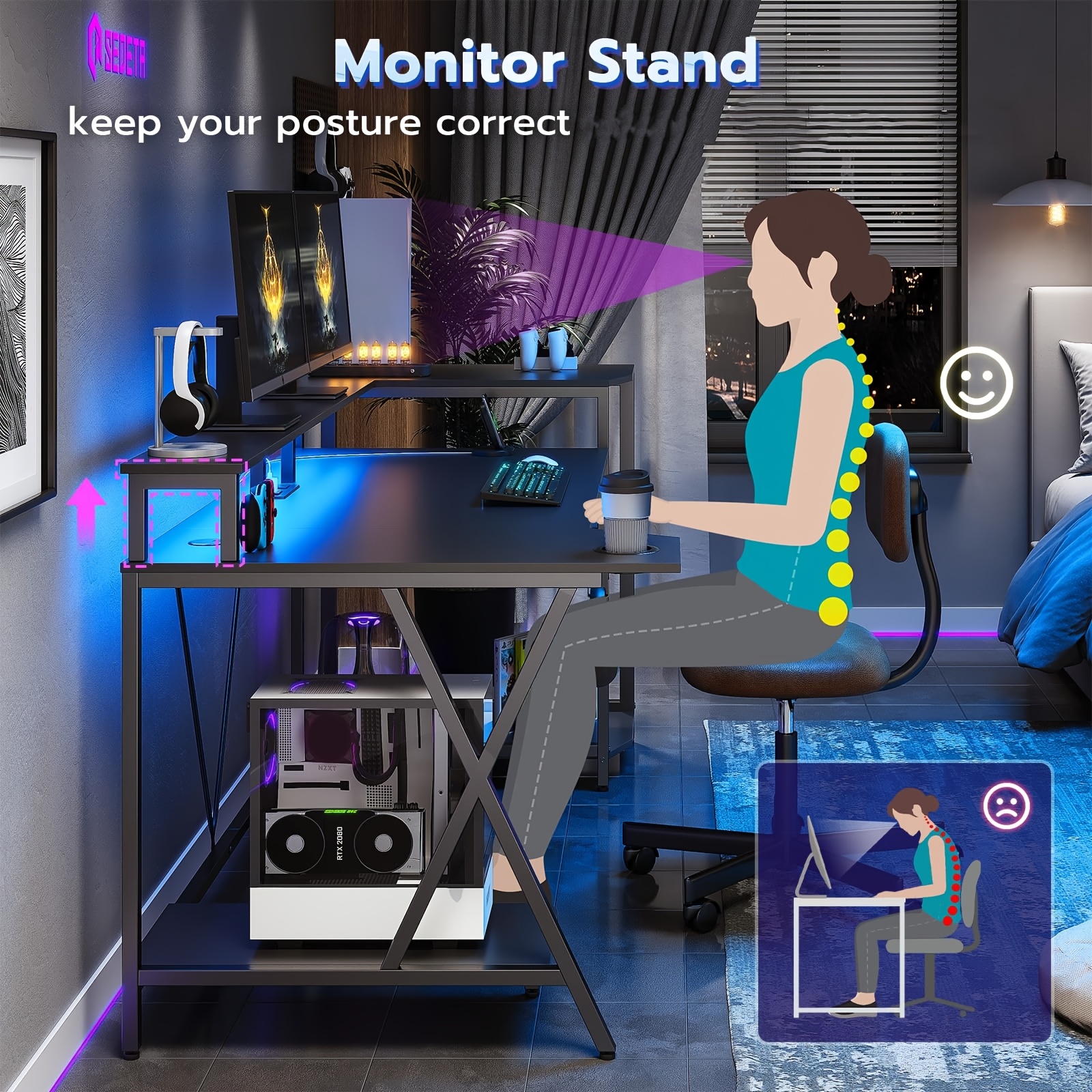 This ergonomic gaming desk is equipped with a monitor stand, LED lighting, power sockets, a three-tier storage shelf, a cup holder, a headphone hook, and a CPU holder. All these features contribute to a comfortable gaming and working experience. However, it is not just a gaming desk; it is actually a versatile workstation suitable for gaming, working, or studying.