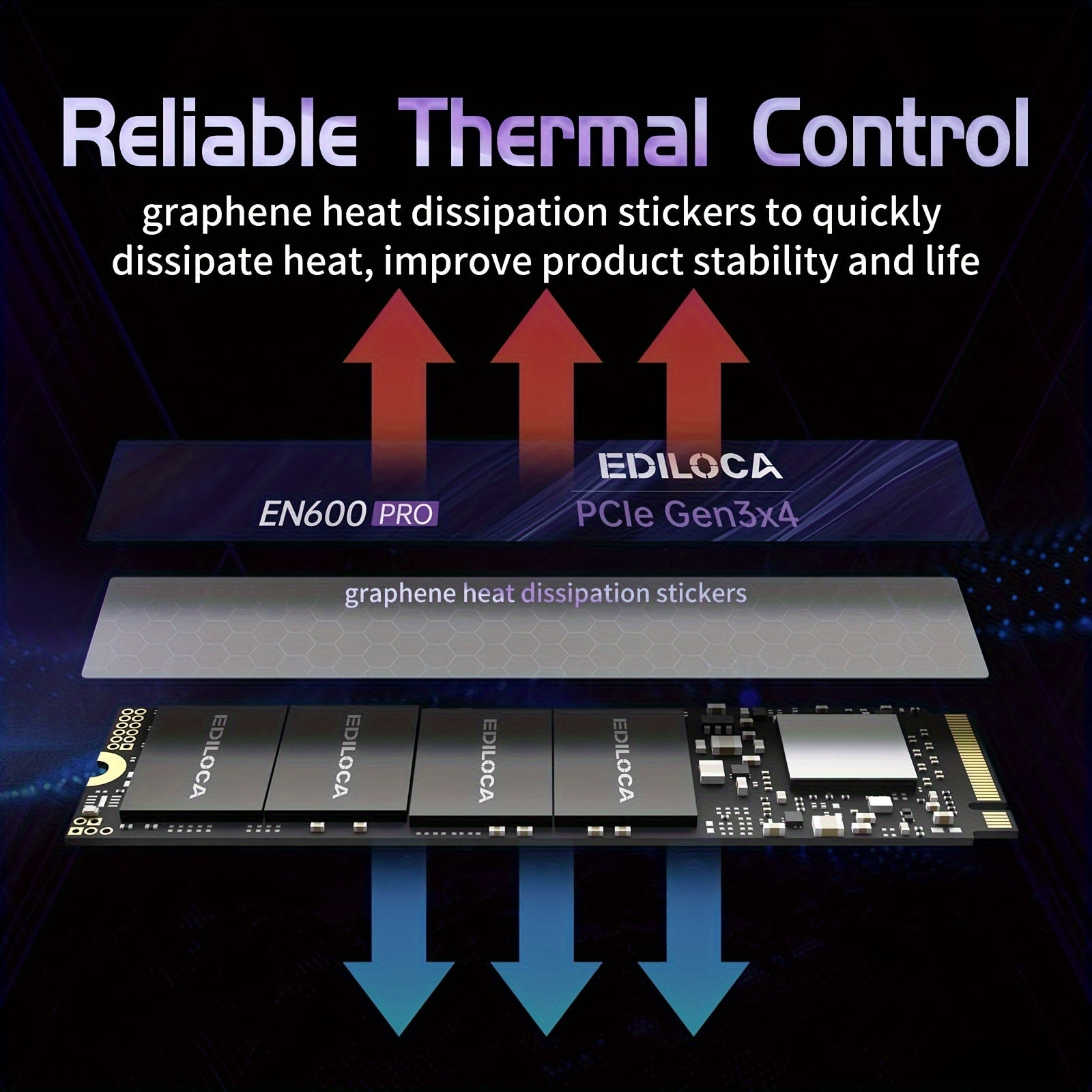 - EXCELLENT PERFORMANCE - EDILOCA EN600Pro M.2 NVMe SSD is equipped with a graphene heat dissipation sticker, which can effectively reduce the temperature of the internal solid state drive and protect the hardware from the risk of overheating damage. It is an ideal choice for high-performance computers and servers.